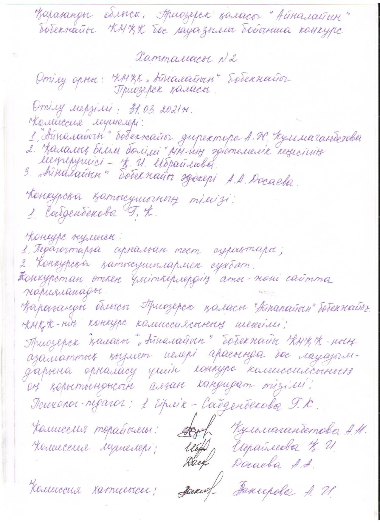 2021ж.31.03 күні өтілген конкурстың шешімі