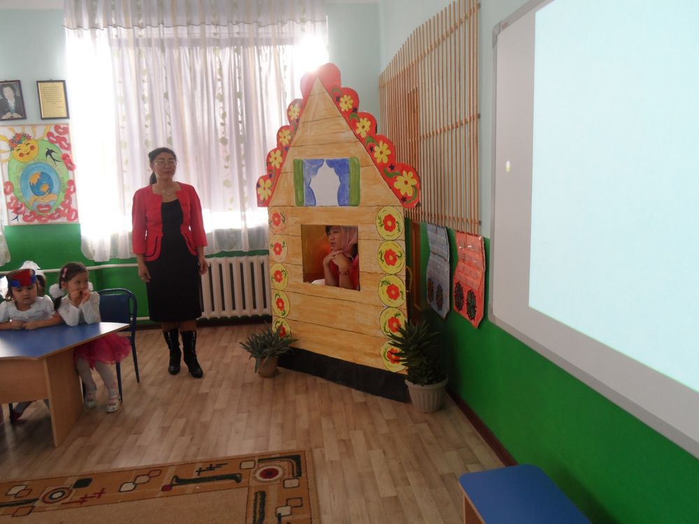 -Балалар,қазір жылдың қай мезгілі? -Күз мезгілін атаңдар? Педагог:Қымбатты балалар,қандай ертегі білесіңдер? Педагог:Олай болса,Маша мен аю ертегісінің қойлымын тамашалаймыз! Балалар,бүгін біз ертегілер еліндегі ғажайып пішіндермен таныспақпыз. Ерте,ерте,ертеде бір әсем сарайда Маша атты бір ерке қыз өмір сүріпті,оның әдемі сарайы болыпты. Сол сарайда жалғыз тұрыпты.Жалғыз тұрып іші пысқан Маша былай деп армандайды: Маша: О, шіркін? Менің мынадай сарайымда көп достарым болса ғой! Мен олармен бірге есеп шығарып, ойнап көңіл көтерер едім. Осы кезде біреу есік қағады. Аю: Кім бар мына әсем сарайда? Рұқсат болса кірейін. Маша: Мен Машамын. Сен кімсің? Аю: Мен Аюмын. Мен үшбұрыш ала келдім, сені таныстырайын, оның үш бұрышы, үш қабырғасы, үш төбесі бар. Ол тура сенің үйіңнің төбесіне ұқсайды. Маша: А солай ма, мен білмеппін.