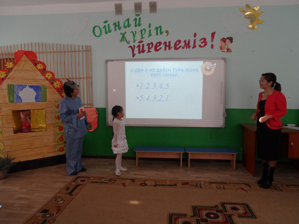-Енді біздің балаларда санамақ білетін болар, қане кім айтып береді? Тәрбиеші: Жарайсың Түлкі.