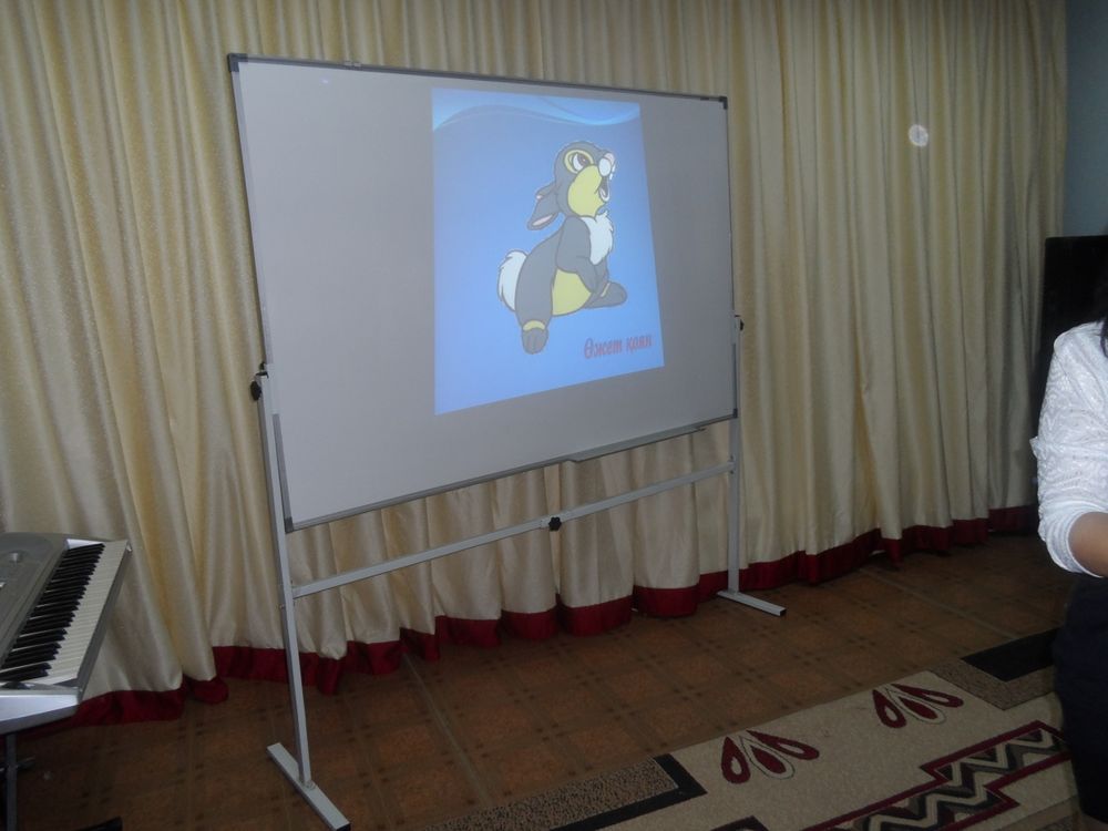Шеберлік сыныбы Қоянды кейіпкер ретінде ала отырып, оның іс-әрекеттерін қимыл-қозғалыстармен сомдауды үйрету. Қимыл-қозғалыстарды есте сақтау қабілеттерін арттыру, дене сымбатын жаттықтыру.Музыка ырғағын есту және ұрмалы аспаптармен сол ырғаққа қосылу, дұрыс естуді қабылдауды жетілдіру мақсатында өткізілді.