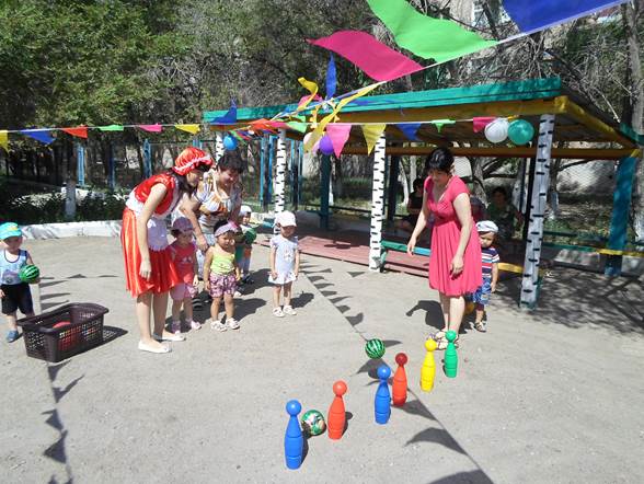 Тәрбиеші балаларға допты кеглиларға дәлдеп лақтыруды үйретті. «Балапан» тобының балаларына қызыл-телпек, қоян, қонаққа келіп қызықтырып ойын ойнатты.