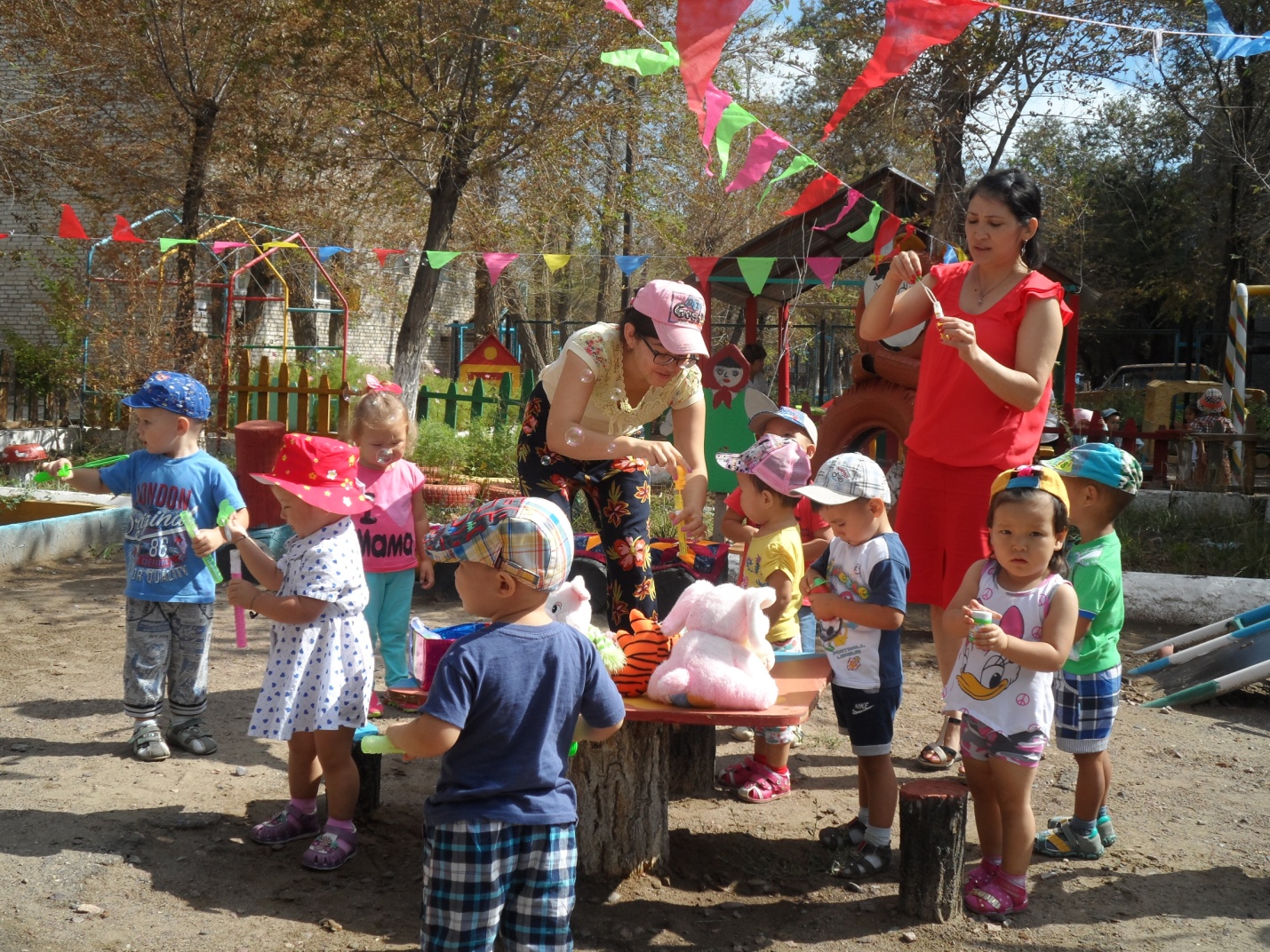 «Айналайын» бөбекжайында тәрбиеші Юсенова А.В. 1-ші кіші сәбилер тобымен «Сабын көпіршіктері» тақырыбында жаздық іс-шара өткізді.Аула безендірілді. Балалар пойызға отырып, қонаққа келіп, шаттық шеңберін жасады.