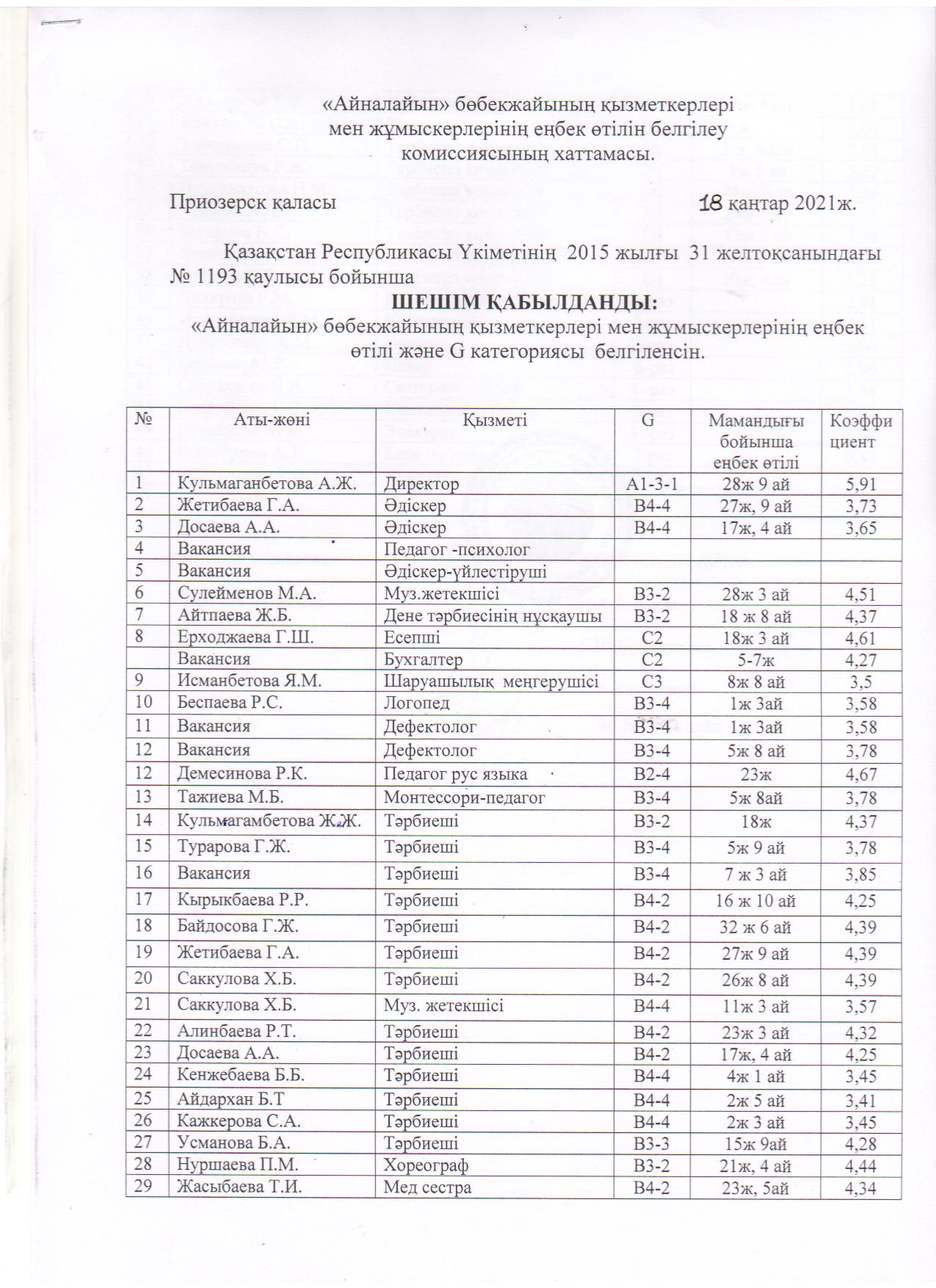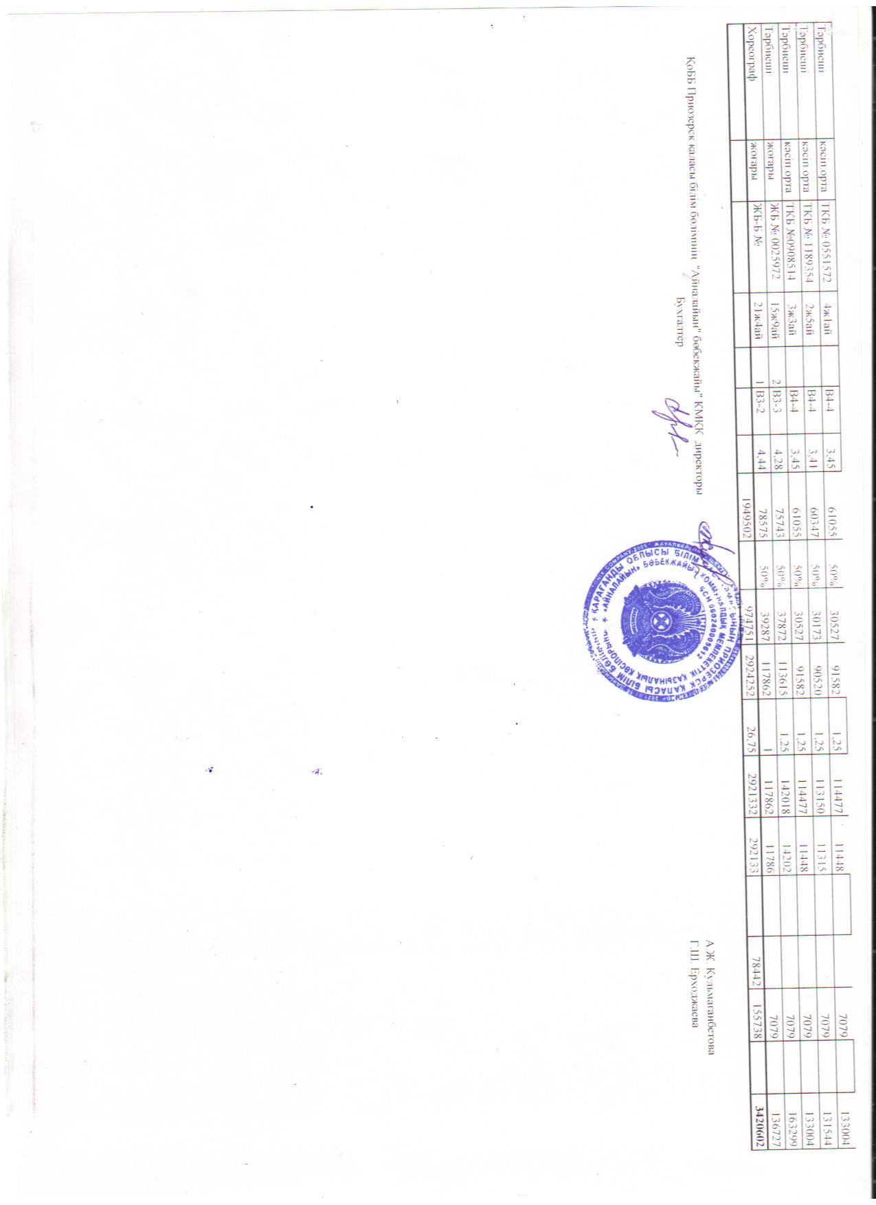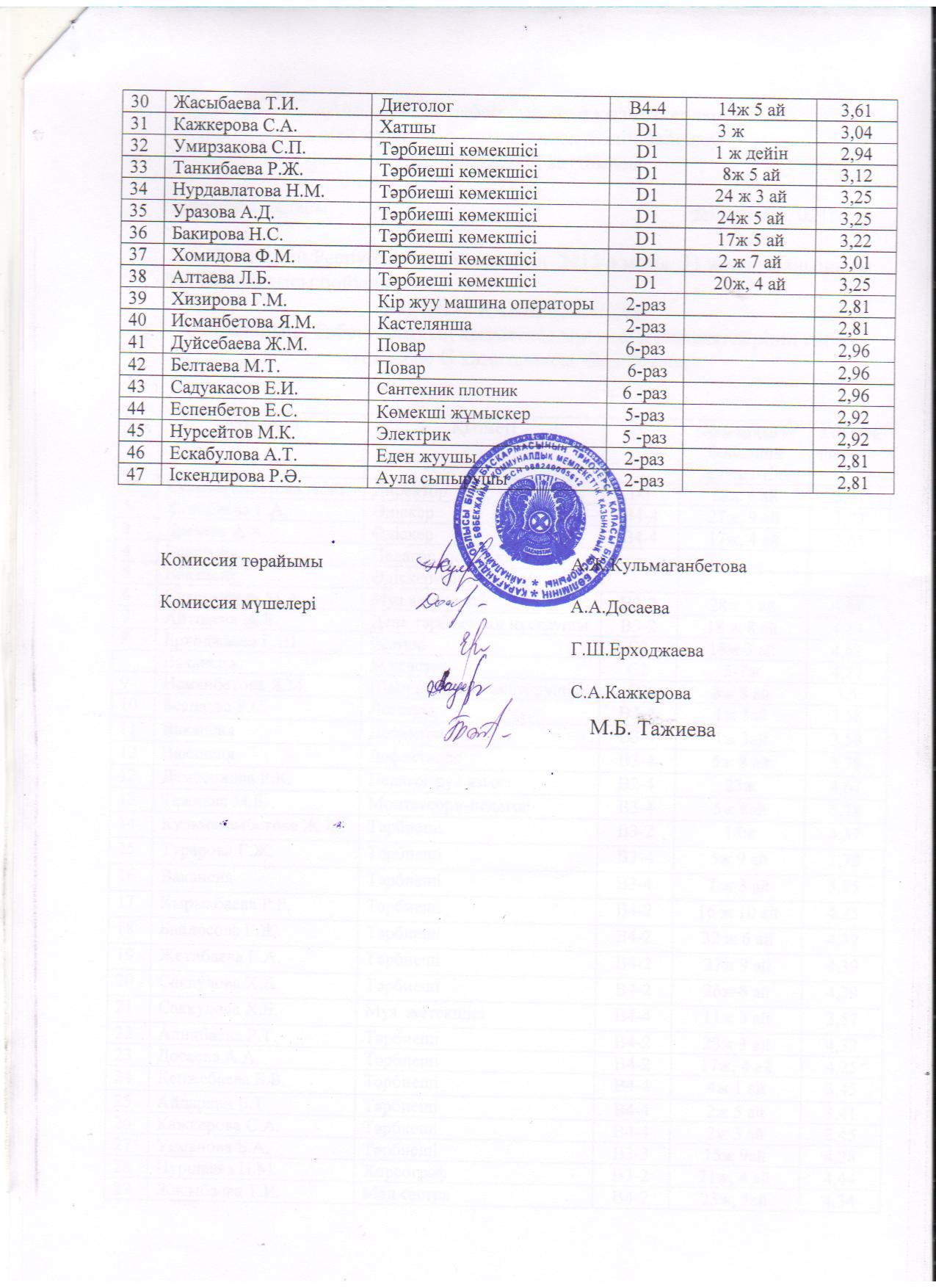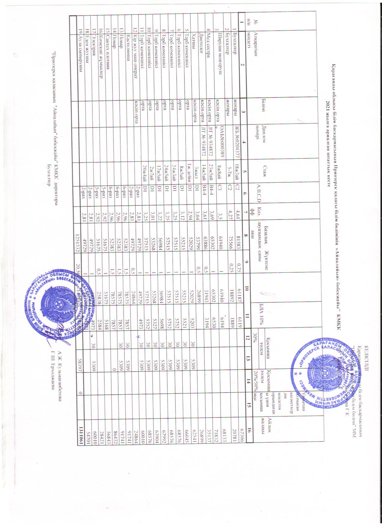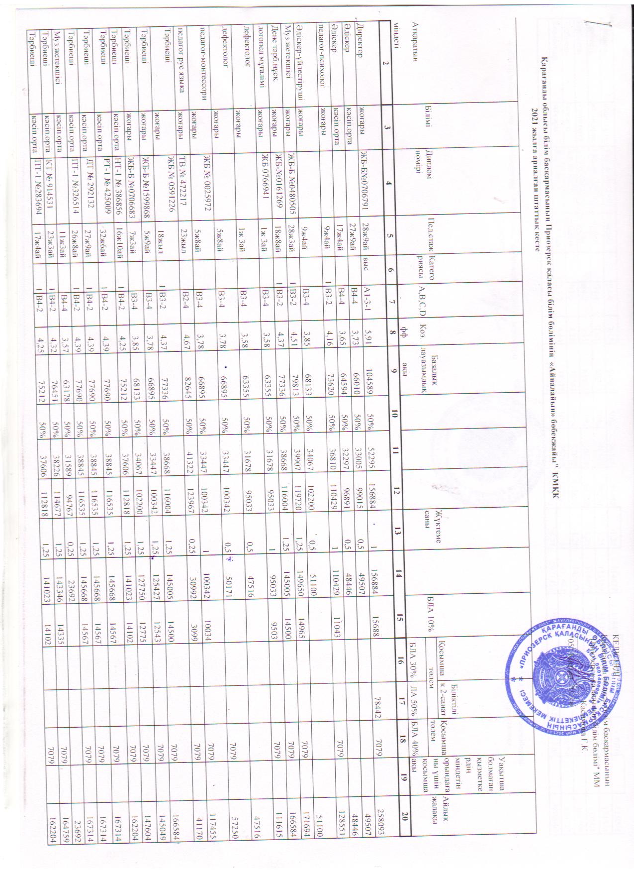 2020 жылға арналған тарификациялық тізімі (педагогтар)