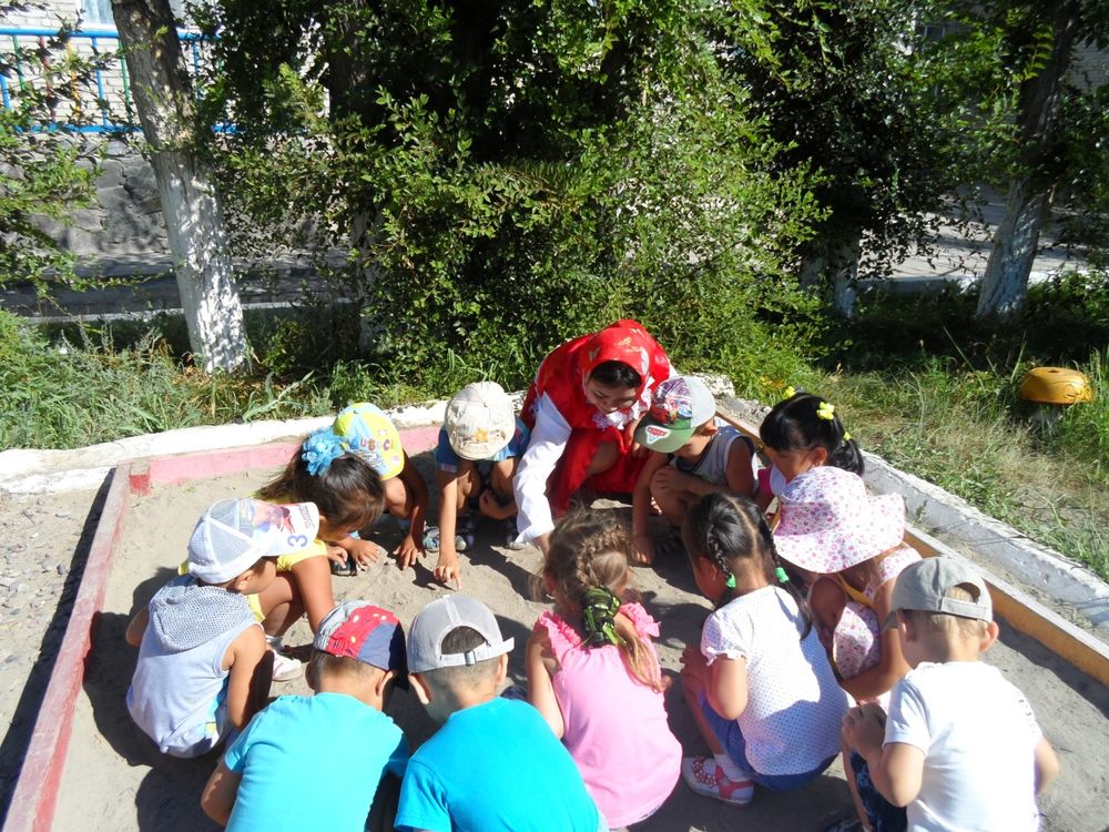 Балалар ойын алаңында саусақпен сурет салу ойыны ойнатылды. Балалар Машамен бірге қосылып, құмға түрлі өрнектер, мәселен, жүректің,гүлдің,торттың бедерін түсірді. Ойын соңында Машаға арналған қимылды өлеңдер айтылды. Сонымен қатар Машаға арнап құмның астына жасырынған сыйлықты балалар асқан көрегенділікпен дәл тапты.