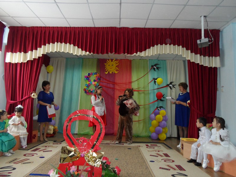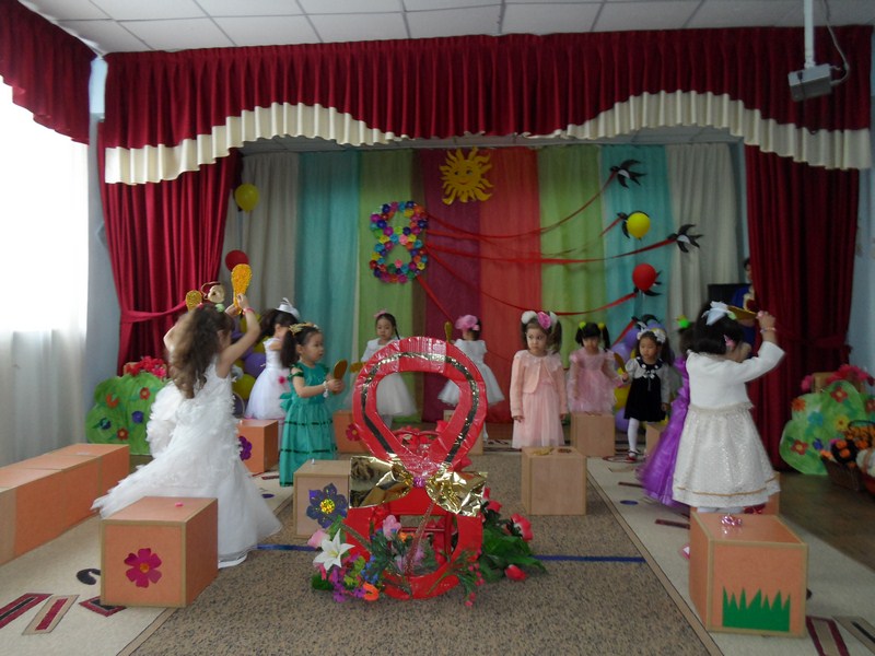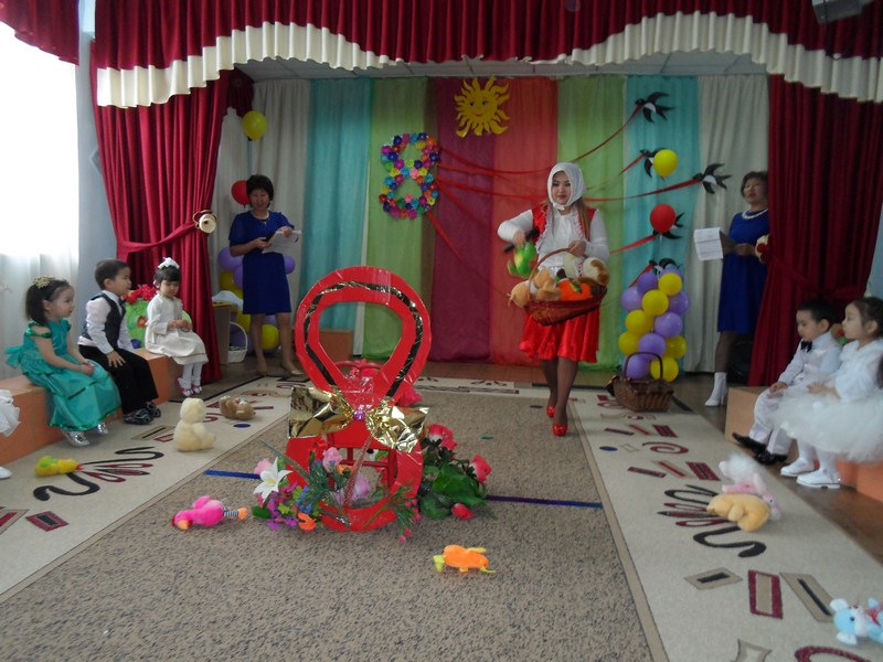 Бүлдіршіндер өлең жолдарын айтып, ән шырқап, биді билеп аналарына, әжелеріне тарту етті.Сонымен қатар қонақ болып келген Маша мен Миша көргенде бүлдіршіндер қатты қуанды.Машамен бірге «Ойыншықтар жинау» ойынын ойнады. Мишамен болса «Аю,аю тұршы» әніне биін биледі. «Шебер аналар» сайысы өткізілді. Аналарда өз шеберліктерін көрсетті. Мойындарына моншақтар жасады. Бүлдіршіндер аналарына, әжелеріне сыйлықтарын берді. Ал топтың ұлдары қыздарға гүл сыйлады. Көтеріңкі көңіл - күймен үйлеріне қайтты.