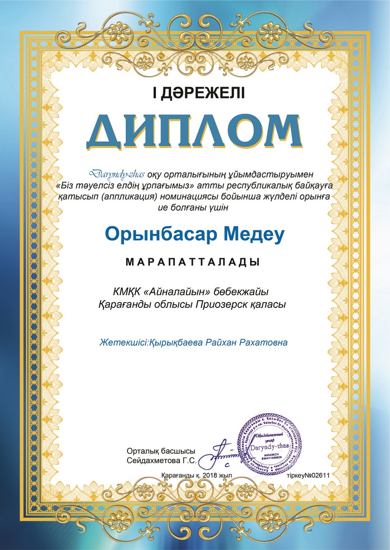 2018 жылдың 20 қарашадан бастап 20 желтоқсан аралығында «Біз тәуелсіз елдің ұрпағымыз» атты оқушылар мен балаларға арналған қашықтық конкурсы өткізілді. Конкурс қорытындысы бойынша «Айналайын» бөбекжайының тәрбиеленушісі Орынбасар Медеу Daryndy zhas «Біз тәуелсіз елдің ұрпағымыз» атты республикалық байқауға қатысып (аппликация) номинациясы бойынша жүлделі орынға ие болғаны үшін І дәрежелі Дипломмен марапатталды, ал Сахи Бексұлтан және Асылбек аяла ІІ дәрежелі Дипломдармен марапатталды. Тәрбиеленушілердің жетекшісі - тәрбиеші Кырыкбаева Р.Р.