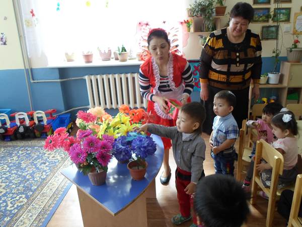 Ход занятия: воспитатель рассказывает, что они прилетели к ним в гости, что бабочки принесли с собой цветы разных цветов. Бабочкам очень нравиться летать, но они уже устали, воспитатель предлагает помочь бабочкам, давайте посадим наших бабочек на цветочек. Каждая бабочка любит садиться на свой цветок. Воспитатель раздаёт им силуэты бабочек и предлагает украсить цветы. У меня красная бабочка, я посажу ее на красный цветочек. Какого цвета у вас? Посадите ее на цветок такого же цвета. Молодцы ребята, все бабочки сели на свои цветочки. В конце игры воспитатель хвалит всех детей за то, что они украсили цветы бабочками и они стали ещё красивее.