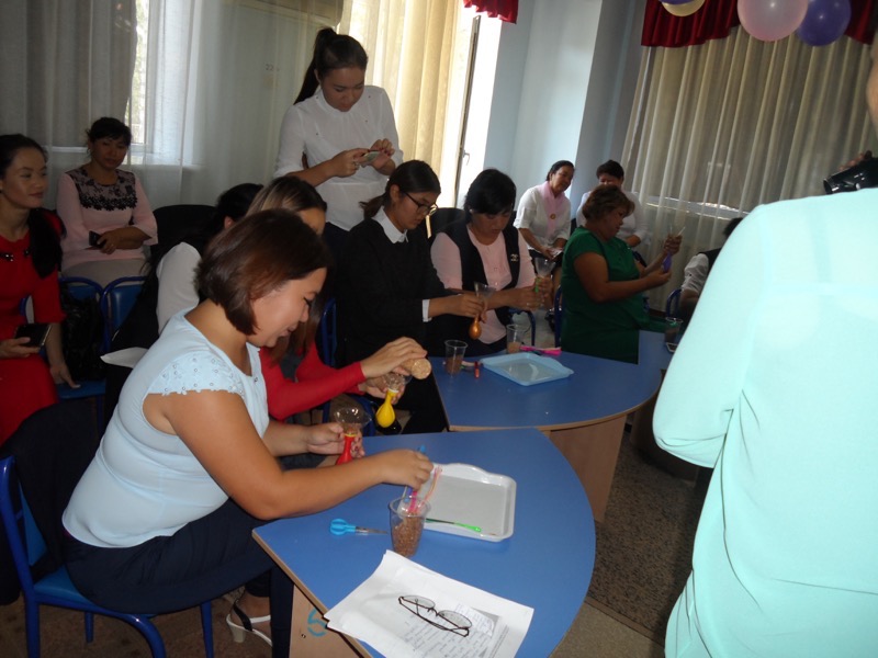 Второе выступление по теме «Балабақшада М.Монтессори әдісі бойынша қолдан жасалған ойыншықтардың қолдануы» мастер-класс показала воспитатель я/с «Айналайын» Досаева Амина Амангельдиевна. Цель мастер-класса: игрушки хорошо развивающие мелкую и крупную моторику можно сделать и своими руками, что это можно сделать из доступного материала. Досаева А.А. предложила гостям на практике сделать сенсорные шарики. Воспитатели с большим интересом и своими руками сделали эти сенсорные шары. Для работы понадобились: шары разных цветов, гречка, горох, воронка, цветные нитки и фломастер для украшения.
