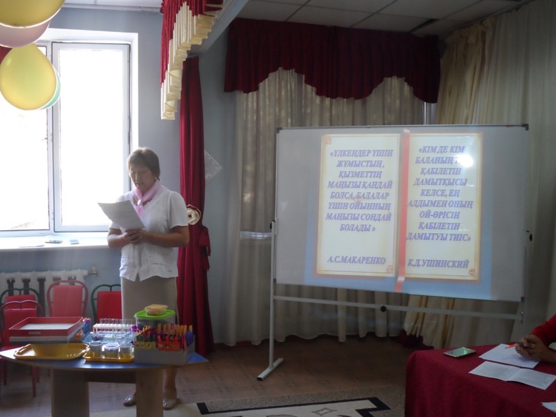 - С докладом на тему: «Білім – болашақ ел жетістігінің іргелі факторы», воспитатель я/с «Балбөбек» Сарманова Балнұр Муратқызы. Также был на примере показан мастер-класс на тему «Мнемотехника в работе с дошкольниками».